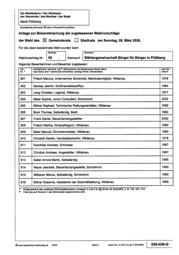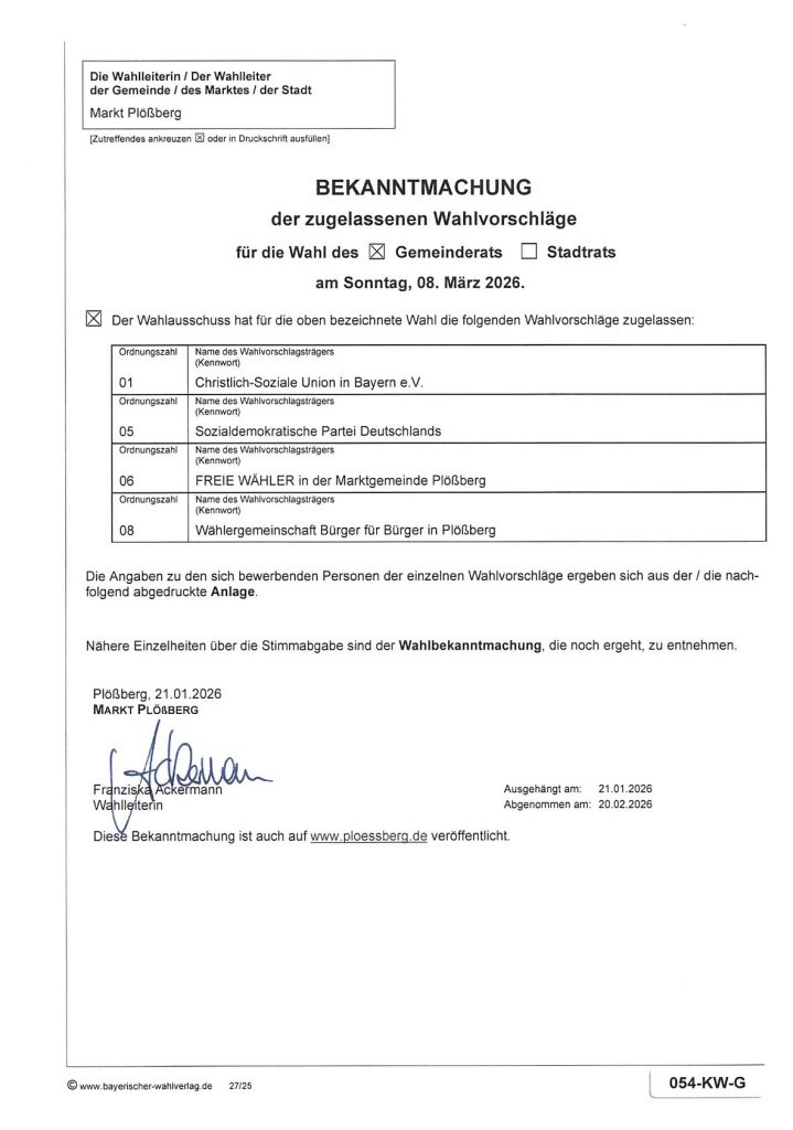 Geschafft! Die Wählergemeinschaft Bürger für Bürger ist offiziell zur Marktratswahl 2026 in Plößberg zugelassen.
